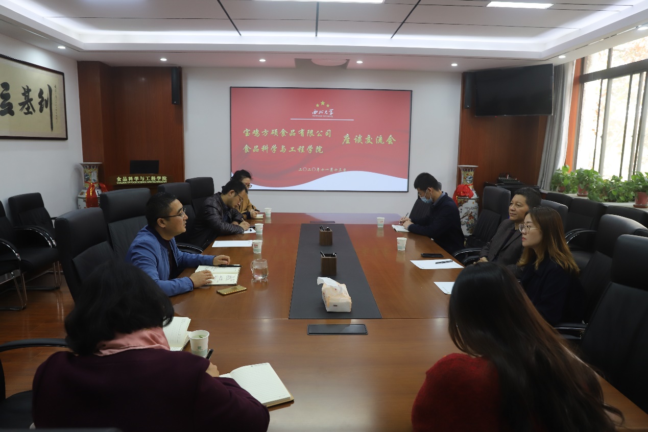 杨新民介绍了方硕食品有限公司的主要情况,并提出了希望加强宝鸡擀面皮加工、生产技术方面合作的意向,希望学院能够针对目前塑封擀面皮生产后出现的淀粉老化、口感保持、防腐处理等难点问题出谋划策,迎合市场需求,解决企业发展困难。