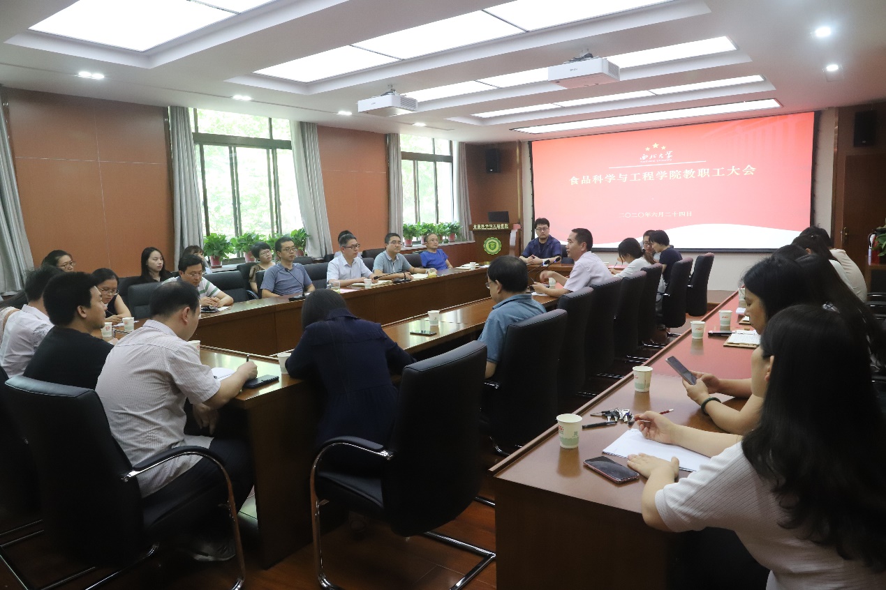 6月24日下午,食品科学与工程学院在6303会议室召开了全院教职工大会,通报教学、科研、研究生以及学院近期情况等,会议由刘晓忠书记主持。