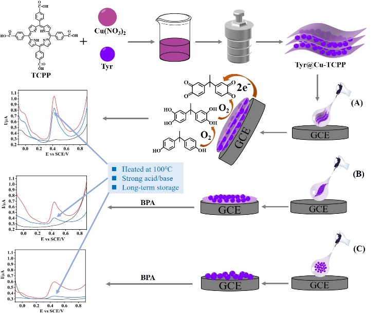 作为合成环氧树脂和聚碳酸酯塑料的单体,双酚A (BPA)广泛存在于塑料制品,特别是食品内层塑料包装、婴幼儿奶瓶等,极易渗入食品中。然而,BPA是一种内分泌干扰物,即使是很低的剂量,也会触发人体雌二醇浓度的变化,损害人体细胞,破坏内分泌系统,降低人体免疫功能,从而诱导心血管疾病、肥胖、发育迟缓和癌症。因此,食品中BPA的精准测定对食品质量安全意义重大。该工作首次将酪氨酸酶层层自组装于2D卟啉MOF材料,并将其应用于BPA电化学生物传感器的构建,基于酪氨酸酶对BPA的催化活性,建立了一种快速检测BPA的电化学传感新方法。由于2D卟啉MOF可在强酸/碱、高温、有机溶剂等苛刻环境中保护酪氨酸酶的活性,因此,该方法成功用于食品体系(牛奶、瓶装水等)中BPA的精准测定。相比于其他方法,该方法具有无需复杂样品前处理、特异性好、灵敏度高等优势,为食品复杂体系中有害小分子化合物的快捷检测提供了新思路。
