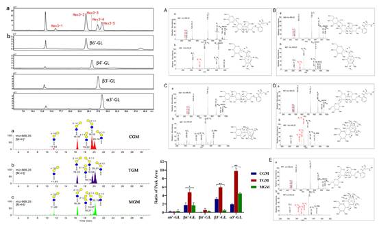 基于前期研究基础,本研究深入开展了山羊乳特征性游离寡糖半乳糖基乳糖的质谱分析研究,建立了一种高灵敏度分离和鉴定羊乳特征性寡糖半乳糖基乳糖异构体的方法,并利用高效液相色谱(HPLC)结合全甲基化分析、多级串联质谱(ESI-MSn)以及在线液质联用等技术定性定量比较了不同泌乳期山羊乳半乳糖基乳糖同分异构体的差异。结果发现,半乳糖基乳糖是羊乳中含量最丰富且具有多种异构体的寡糖结构,分别为:β6’-GL、α6’-GL、β4’-GL、α3’-GL和β3’-GL,其中α6’-GL和β4’-GL是首次发现的山羊乳特征性半乳糖基乳糖结构。经相对定量分析,发现五种半乳糖基乳糖异构体的总含量在过渡乳中最高,β3'-GL是初乳中的主要异构体,α3'-GL是过渡乳和成熟乳中的主要异构体。过渡乳中β3’-GL是初乳的5倍,是成熟乳的2倍,过渡乳中α3’-GL的含量是初乳的2倍,是成熟乳的10倍;经绝对定量分析,发现初乳中β3’-GL含量最丰富为32.31 mg/L,过渡乳和成熟乳中α3’-GL含量最丰富,分别为88.12 mg/L和36.25 mg/L。该结果为深入研究山羊乳半乳糖基乳糖的结构与功能关系奠定基础,对发展以特征性寡糖分子为标志物的羊乳及其制品质量控制体系具有重要意义,为开发以半乳糖基乳糖为配料的功能性食品提供科学依据。