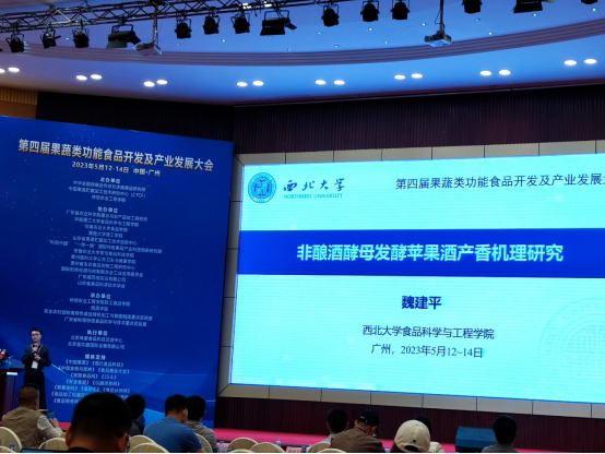 魏建平副教授作了“非酿酒酵母发酵苹果酒的产香机理”会议专题报告,总结了团队在苹果加工领域研究进展,介绍了苹果酒专用的酵母菌株的筛选鉴定工作及非酿酒酵母发酵苹果酒过程中对产香机理研究。