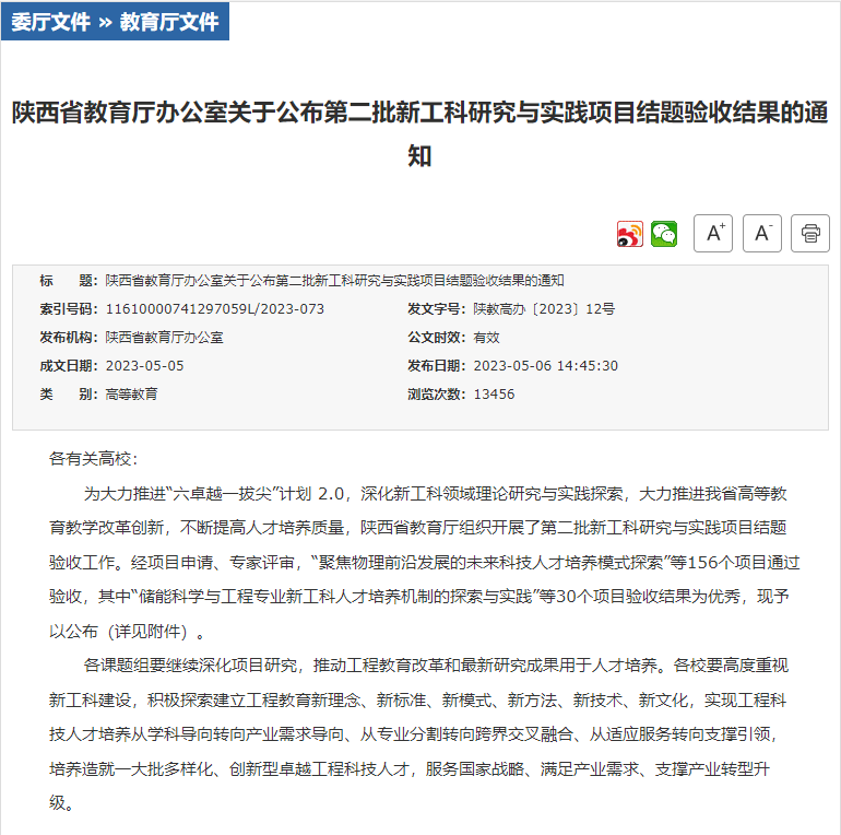 5月5日,陕西省教育厅发布了《陕西省教育厅办公室关于公布第二批新工科研究与实践项目结题验收结果的通知》(陕教高办〔2023〕12号),由beat365在线体育官网曹炜教授主持,吕新刚、高慧、程妮、欧建东、张颖、曹悦、刘茜、刘清清、何亮亮等老师参加的“基于“云工坊”模式的食品学科产教融合创新实践平台建设探索与实践”项目顺利通过结题验收。