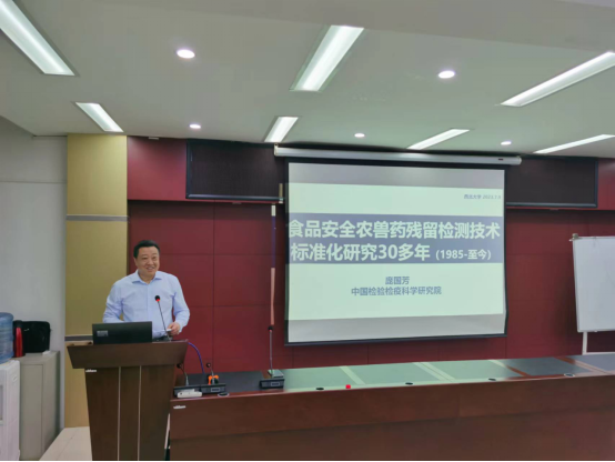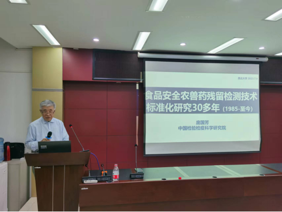 7月9日上午,中国工程院院士,中国检验检疫科学研究院首席科学家庞国芳教授在西北大学太白校区进行了西北大学“杨钟健学术讲座”第二百二十讲“创建农药电子身份证实现食品农药残留检测技术信息化”。随同庞国芳院士出席本次报告会的有中国农业科学院农产品加工研究所原所长、国家中药材产业技术体系岗位科学家、中国农业国际合作促进会功能农产品分会会长,二级研究员,博士生导师戴小枫教授,团队中草药产业体系岗位科学家孔志强研究员。报告会由岳田利院长主持,食品学院100多人参加了报告会。