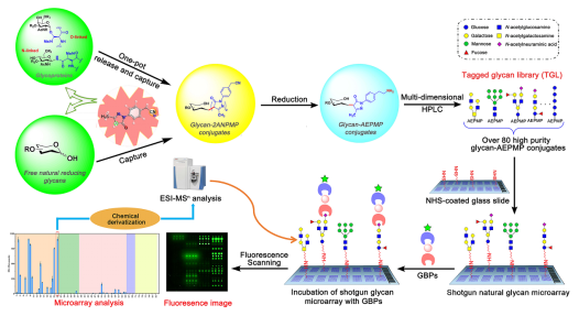 基于以上研究基础,本团队设计合成了一种结构稳定、化学选择性强的吡唑啉酮类异二官能团试剂ANPMP,并发展了糖蛋白N/O-寡糖链释放并同步标记ANPMP、分离制备、结构解析及功能分析一体化平台。成功构建了中等规模结构明确的含有83种天然寡糖单体的结构库和物质库,包括25种猪胃黏蛋白O-寡糖链单体,6种大豆蛋白N-寡糖链单体,40种人乳游离寡糖单体及12种其他来源的寡糖单体。在此基础上构建了一种含有83种天然寡糖分子的寡糖芯片,成功验证了83种天然寡糖与十种不同凝集素之间的特异性识别。随后,首次利用建立的一体化平台,初步研究了寡糖与疾病血清的IgM和IgG结合特性,为疾病的早期筛查提供了新思路。