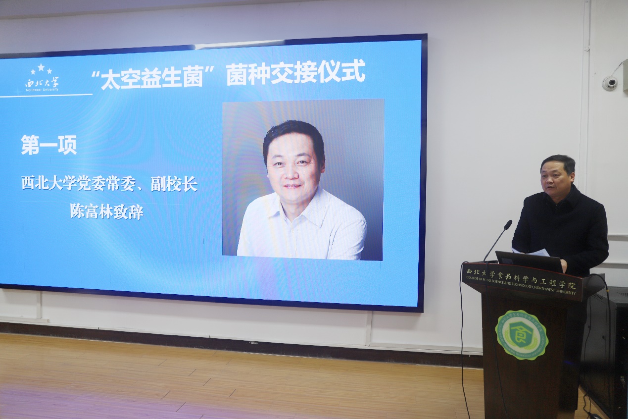 12月25日下午,食品科学与工程学院与北京神飞航天应用技术研究院在西北大学太白校区食品科学与工程学院院楼举行“太空益生菌”菌种交接仪式,出席本次大会的主要领导有西北大学党委常委、副校长陈富林,中国食品工业协会副会长林小平,陕西省农业厅原厅长、西北大学生态毒理研究所所长史志诚、北京神飞航天应用技术研究院常务副院长毛宏伟,以及陕西省餐饮联合会会长靳文平、陕西面食产业促进会会长刘晓钟、陕西西凤酒股份有限公司研发中心主任金成勇、西安饮食集团总经理冯凯、西安冰峰饮料股份有限公司总经理姚军锋、泾河新城茯茶文化产业园发展中心副主任王洋等省内外30余家行业协会及著名食品企业主要负责人、中国食品报、华商网等知名媒体和学校相关科室负责人,食品科学与工程学院师生代表80余人参加了交接大会。