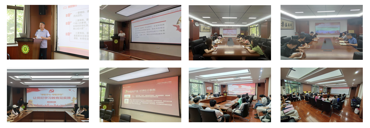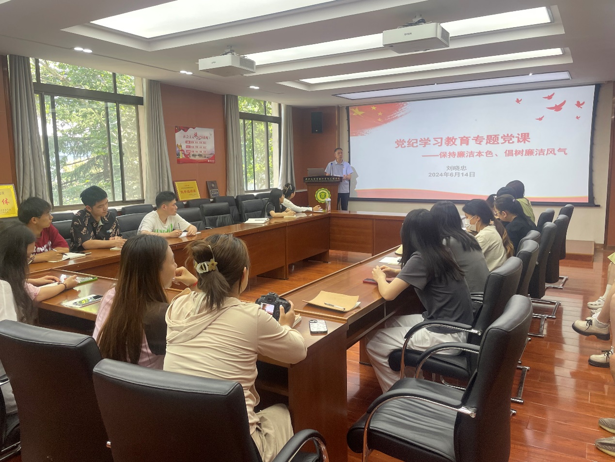 本科生党支部书记张昕梦以“让党纪学习教育见实效”为题讲授专题党课。她阐释了党纪学习的必要性,讲解了《条例》修订的主要变化,并教育引导学生党员把遵规守纪刻印在心。研究生党支部书记高润以“严明纪律,筑牢防线”为主题讲授纪律党课。他结合具体案例,阐述了违反党纪的严重后果,引导大家自觉规范言行,时刻保持清醒头脑,筑牢拒腐防变的思想道德防线。研究生党支部书记王贤以“学纪知纪明纪守纪 做新时代合格大学生党员”为题,从为什么要学党纪、如何学习党纪、党的纪律是什么、如何做到明纪和守纪五个方面讲授了纪律党课。研究生党支部书记赵思怡从坚定理想信念、加强道德品质修养、坚守初心使命和保持清正廉洁入手,为毕业生党员讲授纪律党课,教育引导大家扣好廉洁从业的“第一粒扣子”。
