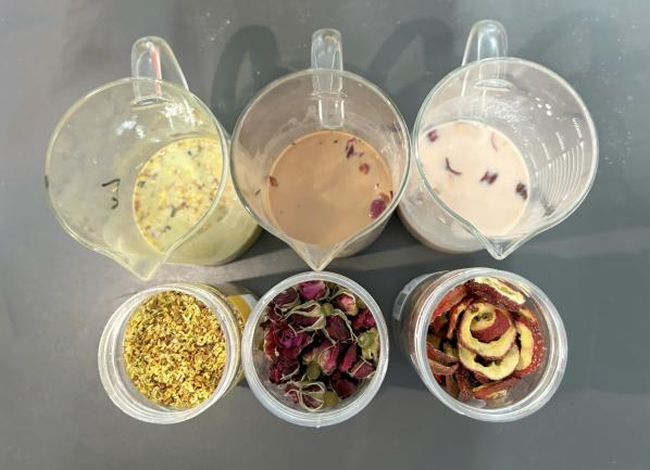 植物乳和米乳茶制作项目中,同学们发挥专业知识与创新思维。制作高蛋白复合植物乳需处理多种原料,经酶解、调配、均质等工序;调配米乳茶则以酶解小米粉为基料,添加不同成分优化配方。