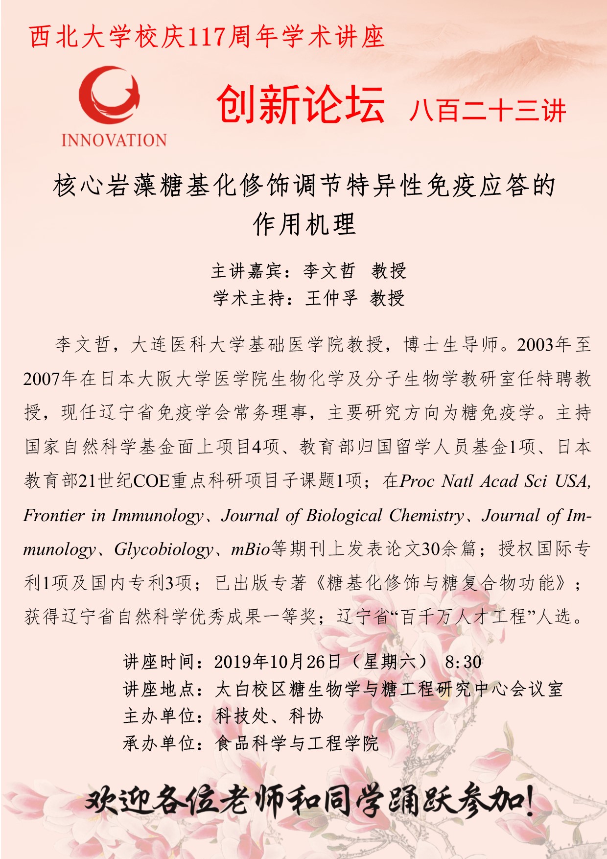 西北大学创新论坛第八百二十三讲暨校庆117周年学术讲座:核心岩藻糖基化修饰调节特异性免疫应答的作用机理
