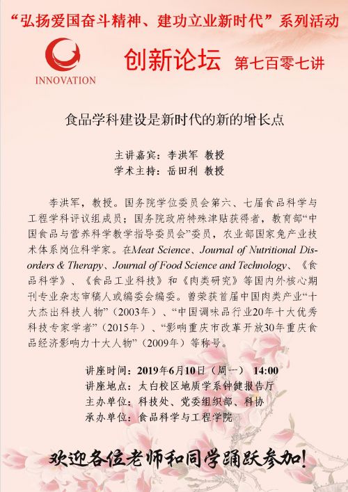 西北大学创新论坛第七百零七讲(“弘扬爱国奋斗精神、建功立业新时代”系列活动):食品学科建设是新时代的新的增长点